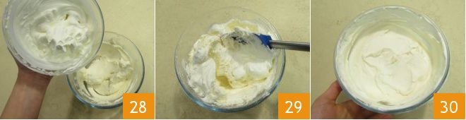 then add the whipped cream 28 and gently mix by moving the spatula from bottom to top to incorporate it 29 until you get a cream with a smooth and uniform consistency 30.