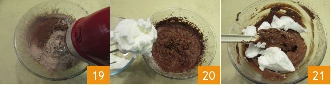 and mix again with the whisk to incorporate all the ingredients 19. Retrieve the whipped egg whites from the refrigerator and fold them into the mixture 20, gently mixing with a spatula from bottom to top to incorporate them 21.