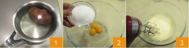 To prepare the chocolate potato cake, first boil the potato in plenty of cold water 1 until it's soft enough to be pierced with a fork: it will take about 25-30 minutes. Meanwhile, separate the egg yolks from the whites, placing them in 2 separate bowls. Add the sugar to the yolks 2 and work with an electric whisk until you get a light and frothy mixture 3, then set it aside.