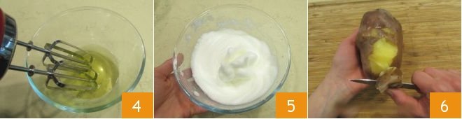 Now take the bowl with the egg whites and whip them to stiff peaks with the electric whisk 4 until they reach a firm consistency 5, then store them in the refrigerator. As soon as the potato is well cooked, drain it and let it cool, then peel it 6.