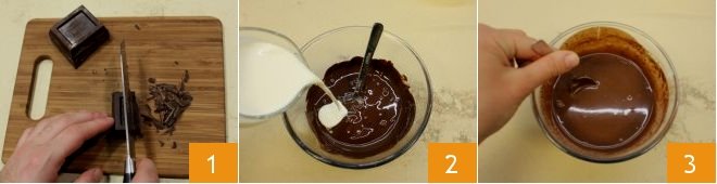 To prepare the chocolate ring cake with hazelnut cream, start with the cake batter: coarsely chop the dark chocolate 1 and melt it in a double boiler or microwave. Once melted, add the previously heated cream 2, stir 3, and let it cool down.