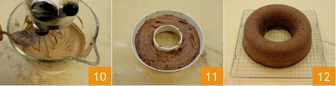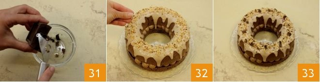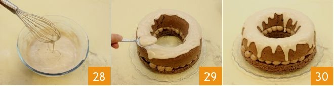 work the mixture with the whisk to make it soft like a glaze 28. Distribute it over the ring cake with a spoon, creating dramatic drips (29-30).