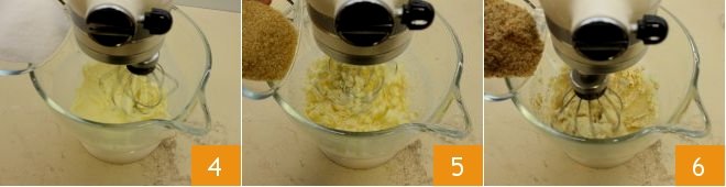 In the meantime, place the softened butter at room temperature in the bowl of a stand mixer (if you don't have a stand mixer, you can use an electric mixer), mount the beaters and start working it into a cream. Add the granulated sugar 4 and once it is incorporated, add the brown sugar 5; once the mixture is well whipped, also pour in the hazelnut flour in a shower-like manner 6.