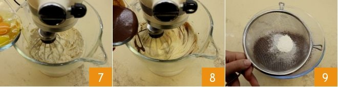 At this point, you can add the eggs one at a time to the batter 7 and once they are incorporated, slowly pour in the cream and melted chocolate mixture 8. In a bowl, sift together the unsweetened cocoa, flour, and baking powder 9.