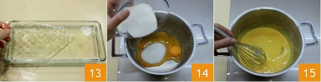Work on the hazelnut cream for the filling: soak the gelatin sheets in a bowl with cold water for at least 10 minutes 13. In the meantime, in a heavy-bottomed saucepan, off the heat, pour the yolks and sugar 14, work them with the whisk until you get a homogeneous and fluid mixture 15.