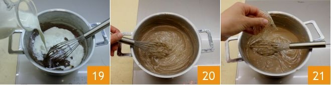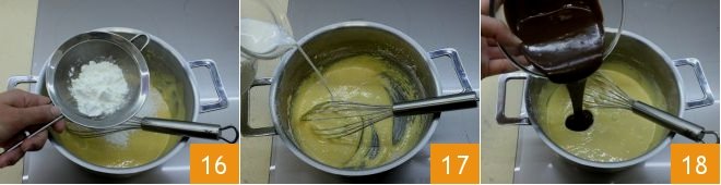 Add the sifted cornstarch 16, mix again with the whisk, then slowly pour in the milk 17 and the hazelnut paste (not a spreadable cream but obtained from refining hazelnuts) 18.