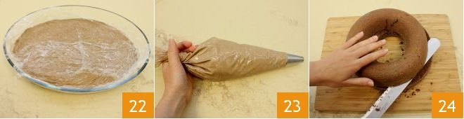 Transfer the cream to a wide, shallow bowl to cool the cream faster. Cover it with cling film touching the surface 22 (to speed up the cooling process if you don't have a home blast chiller, place the bowl with the cream in a larger bowl filled with ice so that it cools quickly while maintaining its consistency); then place it in a piping bag with a rather large plain nozzle 23; you can store the cream in the fridge until ready to use. When the ring cake is cold, cut it in half 24.