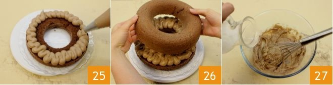Place the base of the ring cake on a serving plate and fill with the hazelnut cream 25, then close with the other half of the ring cake 26. Now focus on the glaze: transfer the remaining hazelnut cream to a bowl and dilute it with fresh liquid cream 27;