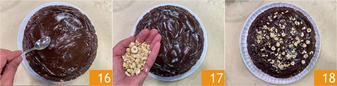 Remove the base from the fridge, unmold it and place it on a serving plate. Spread the glaze over the surface of the base 16, decorate with some chopped hazelnuts 17, and return to the fridge for at least 1 hour. Your chocolate salami cake is ready to be served 18!