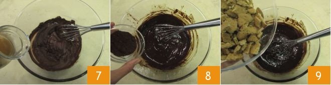 the coffee at room temperature 7, and the unsweetened cocoa powder 8, and blend everything together with the whisk. Finally, add the crumbled cookies 9