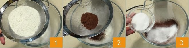 To prepare the chocolate scones, place the sifted flour 1 and cocoa 2 in the bowl of a stand mixer fitted with a paddle. Add the sugar 3 and baking powder.