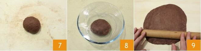 Form a dough ball 7, place it in a bowl, cover with plastic wrap, and let it rest in the refrigerator for 15-20 minutes 8. After this time, take the dough ball and roll it out with a rolling pin into a sheet about 0.4 inches thick 9.