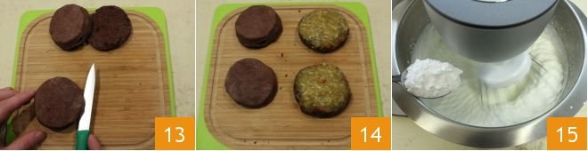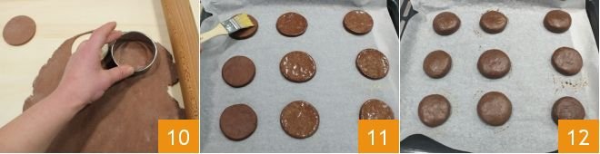 Using a round pastry cutter, about 2.8 inches in diameter, cut out discs 10, about 6, and place them on a baking tray lined with parchment paper. Beat an egg with a tablespoon of milk and brush the surface of the chocolate scones 11. Bake in a static oven preheated to 392°F for 15 minutes (fan oven 356°F for 10 minutes). Remove the scones from the oven, they will be nicely golden brown 12, and let them cool on a wire rack.
