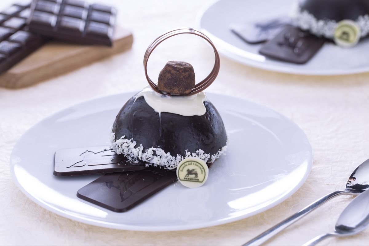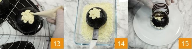 Distribute the white chocolate on top of the dome of the dome cakes, using a piping bag 13. Then place the chocolate shavings in a bowl and dip the base of the dome cake to make the shavings adhere 14. Place the dome cake on a serving plate and place three milk chocolate rings on top, making them adhere to the white chocolate, which will act as an adhesive 15.