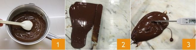 To create the decorations, it is necessary to temper the chocolate; this process will not only make the chocolate shiny but will also maintain its qualities in terms of consistency.: melt the milk chocolate in a bain-marie (the water in the saucepan should not touch the bottom of the bowl where you put the chocolate) 1; when the chocolate reaches a temperature of 113-122°F (measure with a kitchen thermometer), pour 2/3 of it onto the marble slab placed on a work surface 2 and start spreading the chocolate on the marble slab with a spatula and a scraper, spreading it over the surface 3. When it reaches 80°F 3, transfer it to the bowl where you left the remaining 1/3 and mix. The chocolate should reach 84°F. If during these stages the temperature drops too much, always keep the bain-marie saucepan with hot water on hand to slightly heat the chocolate. Conversely, if it is still too hot, repeat the operation of spreading on marble with a small part of the chocolate.