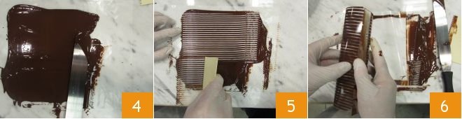 Place a sheet of acetate on the work surface and spread the tempered chocolate on top 4, then with a pastry comb create uniform lines 5. Fold the acetate sheet to create a tube 6, leaving the chocolate stripes inside.