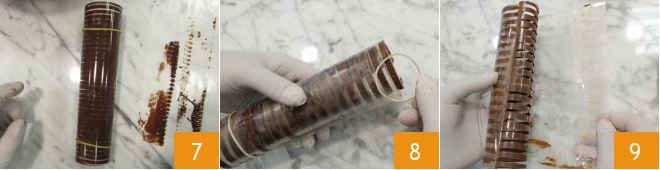 Wrap the tube with two rubber bands at both ends 7 and place it in the fridge to set. When it is solid, remove the rubber bands 8 and unroll the sheet 9
