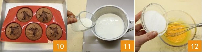 When done, remove from the oven 10, let them cool slightly, and then unmold onto a wire rack and wait until they are completely cold before filling them. Meanwhile, prepare the cream: pour the milk and cream into a saucepan 11 and heat until just below boiling. In a separate bowl, beat the yolks with the sugar 12,