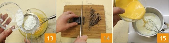 then sift the cornstarch into the egg and sugar mixture 13. Finely chop the dark chocolate and set aside 14. Pour the egg-based mixture you have prepared, mixing well with a whisk 15.