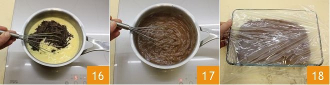 When the cream has thickened, turn off the heat and add the chopped dark chocolate, stirring again to melt it 16. Once the chocolate is completely melted 17, pour the cream into a wide, shallow dish and let it cool to room temperature, covering with plastic wrap 18.