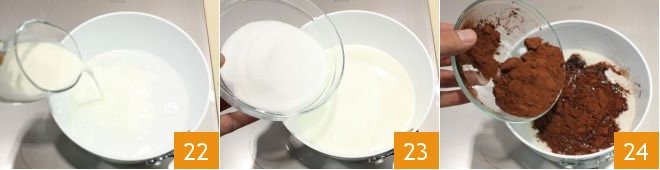 In a saucepan, pour milk, cream 22, sugar 23, and cocoa 24. Bring to a boil, stirring with a whisk.