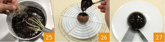 and then add the well-wrung and drained gelatin 25. When the glaze has a temperature not exceeding 90°F (you can measure with a kitchen thermometer), pour it over the dome cakes 25, which you have placed on a wire rack with a plate 26 or a tray underneath (to collect any excess glaze that drips). When it has dried, transfer each dome cake to a dessert plate 27.