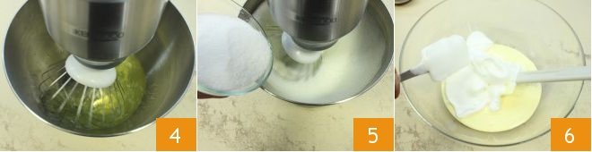 Beat the egg whites with a whisk 4 and when they are white, add the remaining sugar to beat them until stiff peaks form 5 (you can also use an electric mixer to beat the eggs). Combine the two mixtures and gently mix with a spatula from top to bottom 6 to avoid deflating them.