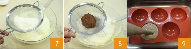 Incorporate the sifted flour 7 and cocoa powder 8 into the dough, always mixing gently to keep the mixture well aerated. Baking powder is not necessary in this recipe because the air has already been incorporated by beating the eggs. Transfer the mixture into a disposable piping bag and fill a single-serving silicone dome mold 9 (or a greased and floured aluminum mold). Bake the domes in a preheated static oven at 350°F for 30 minutes (or in a fan oven at 320°F for 20 minutes).