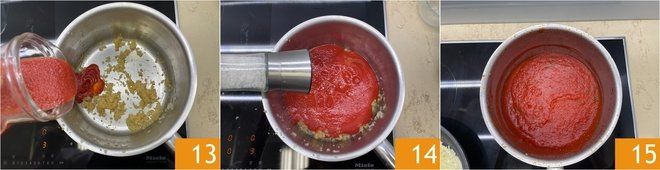 Let it stew over low heat for about 10 minutes, then add the tomato sauce 13, salt 14, and continue cooking over medium-low heat for about 30 minutes. At the end of cooking 15, adjust the salt, add the basil leaves, and remove the garlic.