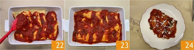 Cover with the remaining sauce 22 and bake in a preheated static oven at 400°F for about 15 minutes. After the cooking time, take them out of the oven 23 and serve. Top with grated salted ricotta, and your Christmas crepes are ready to be served 24!