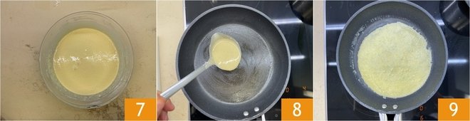 Cover the batter with plastic wrap and let it rest in the refrigerator for 10 minutes 7. Heat a crepe maker, add a piece of butter and let it melt, then spread it well over the entire surface with a brush or a paper towel. Pour a ladle of batter in the center of the pan 8 and distribute the batter evenly. Cook for one minute on each side over medium heat 9.