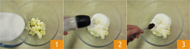 To prepare the Christmas cupcakes, place the softened butter in a bowl, add the sugar 1, a pinch of salt 2, and the vanilla extract 3.