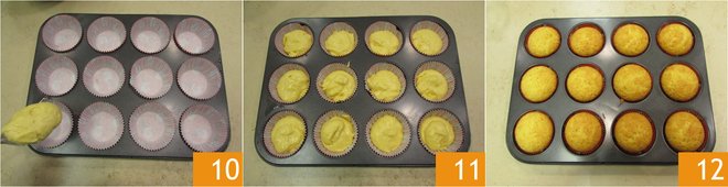 Line a 12-cup muffin tin with paper liners, then fill them with about 50g (approximately 1.75 oz) of batter each, using a spoon 11 12. Before baking, tap the pan several times on the work surface to level the surface carefully, so you'll get puffy cupcakes with a flat surface. Bake in a preheated oven at 350°F for about 25-30 minutes, then proceed with the second batch: with these quantities, you will get approximately 24 cupcakes. Once cooked, let them cool at room temperature before decorating them 12.