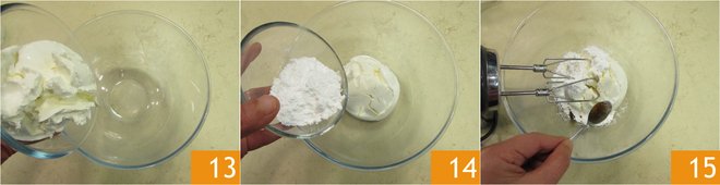Now, work the mascarpone with electric mixers 13 together with the sugar 14 and the vanilla extract 15.