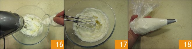 Pour in the cream 16 until you obtain whipped cream 17. Transfer the cream into a piping bag with a star tip 18 and place it in the fridge.