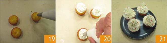 Take the now-cooled cupcakes 19 and decorate them with the frosting 20. Garnish with colorful sprinkles and serve your Christmas cupcakes 21!