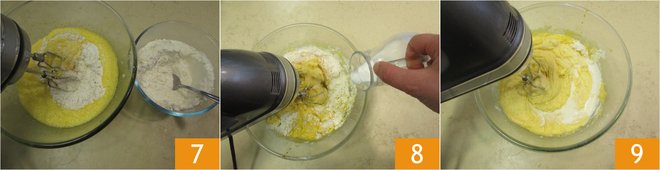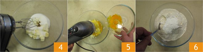 Turn on the mixers at medium-high speed 4 and let the mixture slightly whip. After a few minutes, add the eggs a little at a time 5, continuing to work with the mixers. Sift the dry ingredients into a bowl 6.