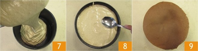 Pour the batter into a mold with a diameter of 7 inches, at least 4 inches high, that you have previously buttered or lined with parchment paper 7. Level the surface with the back of a spoon 8 and bake in a preheated static oven at 350°F for about 25 minutes. Once baked, remove the sponge cake from the oven and let it cool completely in the mold 9.