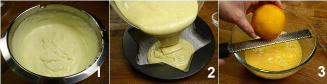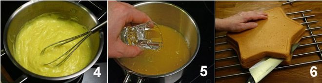 Prepare the sponge cake with the indicated quantities 1, following the recipe found by clicking Sponge cake. Pour the mixture into a star-shaped mold previously buttered and floured 2 and bake for about 40 minutes at 356°F. In the meantime, prepare a custard with the indicated quantities, following the preparation indicated Pastry cream, to which you will add grated orange zest 3.