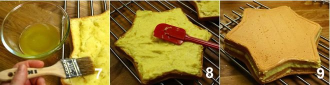 Brush the inside of the two sponge cake halves with the prepared syrup 7 and, with the help of a spatula, spread the orange cream on the base of the cake 8, then cover it with the other half 9. With a smooth-bladed knife, level the cream well on the sides of the cake, so that the side walls are smooth.