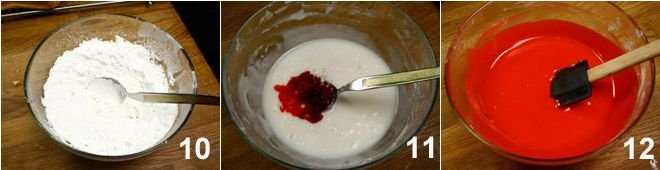 At this point, prepare the glaze for coating the cake. Put the powdered sugar in a bowl and add enough hot water to make the mixture smooth but thick 10. Add red food coloring, which can be in powder or liquid form (if it's powder, dissolve it in a small amount of hot water) 11 and mix well to achieve a uniform color 12.