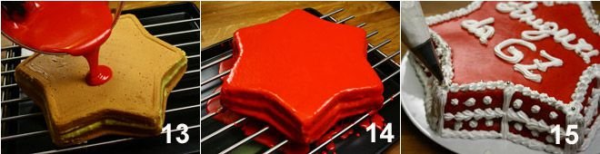Before proceeding with the coating, place a tray or baking sheet under the cake so that the excess glaze falls inside, preventing the work surface from getting dirty and can be easily recovered 13. Spread the glaze well, even on the sides of the cake, then let it dry 14, then transfer it to a serving plate and proceed with the decoration, using the mixture obtained by combining two whipped egg whites with powdered sugar. The mixture should be very thick 15, so if necessary, add a few more teaspoons of powdered sugar. Using a piping bag with a star tip, decorate the cake as shown in the picture or as you prefer, add some silver sprinkles and ... happy holidays!