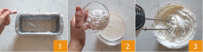 To make the Christmas tile, first line a 12-inch loaf pan with plastic food wrap 1. Pour the cream into a bowl, add the powdered sugar 2, and whip with an electric mixer until firm and stiff 3. Divide the whipped cream into 2 equal parts: use one part immediately for the filling, while keeping the other part in the refrigerator for decoration.