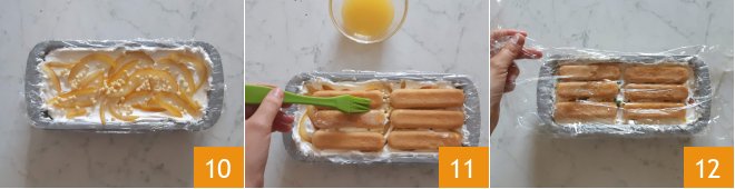Continue in the same way by adding whipped cream, candied peel, and the remaining white chocolate chips 10. Finish with a final layer of ladyfingers and brush them with orange juice 11, then cover the mold with plastic wrap 12 and refrigerate to set for about an hour.