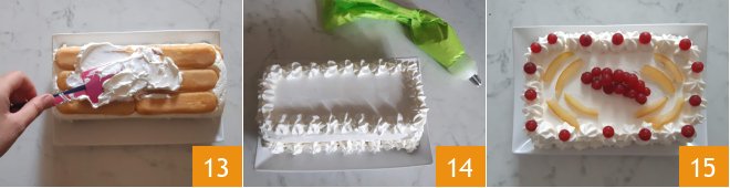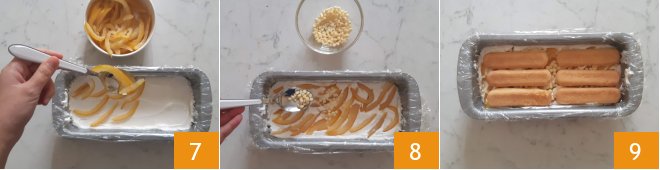 Place some candied oranges on the cream 7 and add half of the white chocolate chips 8, then form another layer of ladyfingers 9 and moisten them with orange juice.