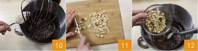 Add the flour with the baking powder to the chocolate mixture 10, one spoonful at a time, mixing well and being careful not to form lumps. On a cutting board, roughly chop the hazelnuts 11 using a knife, then add them to the batter 12.