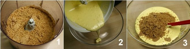 First, chop the almonds and hazelnuts in a mixer 1. Then, beat the egg yolks very well with half of the sugar until they become a thick and creamy mixture, then pour them into a bowl 2. Add the chopped nuts to the beaten eggs 3 and mix everything together.