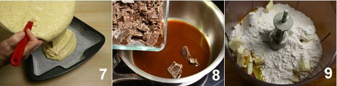Pour the batter into the cake pan 7 and place it in a pre-heated oven for 45 minutes at 320°F. While the cake is baking, prepare the creams. For the filling, melt the chocolate, previously coarsely chopped with a knife, in a saucepan over very low heat along with the coffee 8. In a mixer, work the butter with powdered sugar and the egg yolks 9.