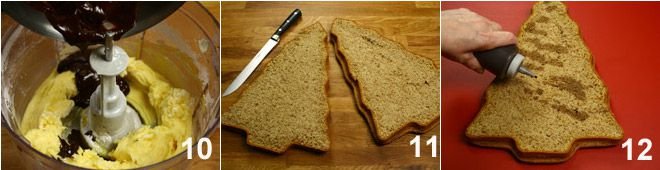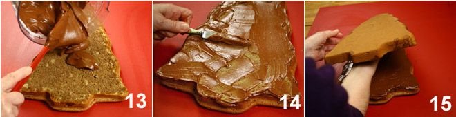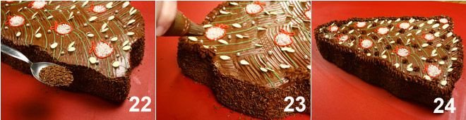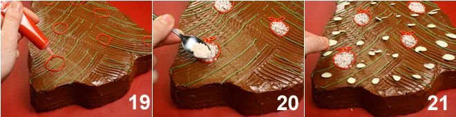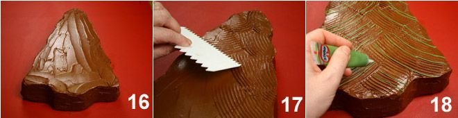 Spread the chocolate cream on the surface 16 and, with the help of a spatula with pointed ends (alternatively use a fork), draw lines to simulate pine needles 17. With the green icing (prepared by mixing powdered sugar and boiling water as needed to get a thick mixture), create some lines by going over some grooves created with the spatula 18.