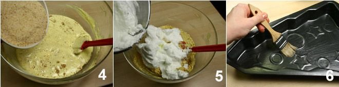 Then incorporate the breadcrumbs 4, mix well, and then add the egg whites previously beaten to stiff peaks with the remaining sugar 5. Butter and flour the mold where you will bake the cake 6.